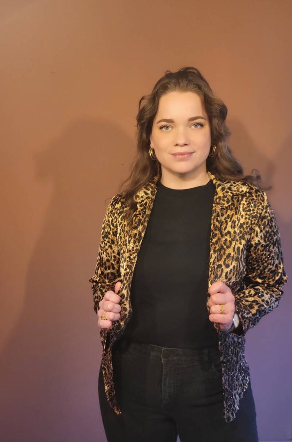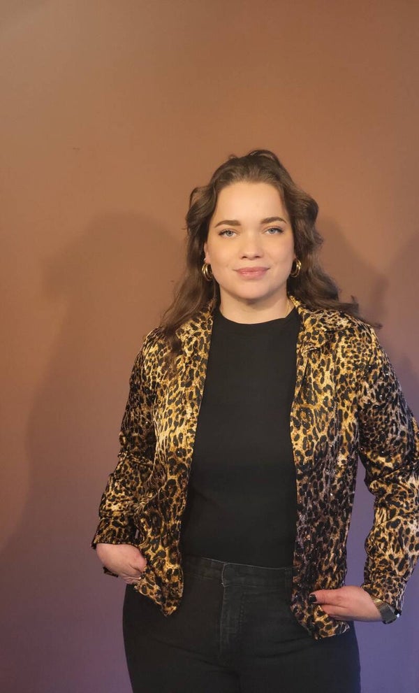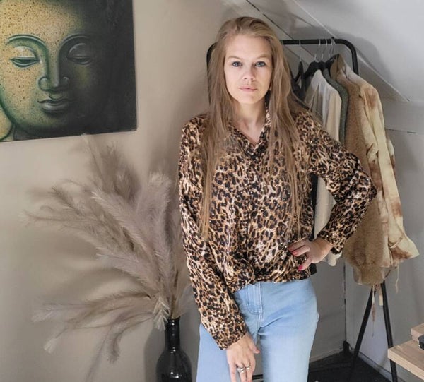 Deze geweldige blouse met glitter. Leuk om dicht te dragen maar hij kan ook open gedragen worden.