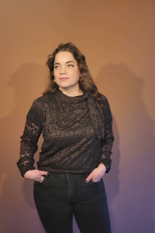 Heel leuk truitje met kant in het grijs, deze hebben we ook in het zwart. Leuk te combineren met een colbertje. Bij de kraag kan een knoop of een strik gemaakt worden.